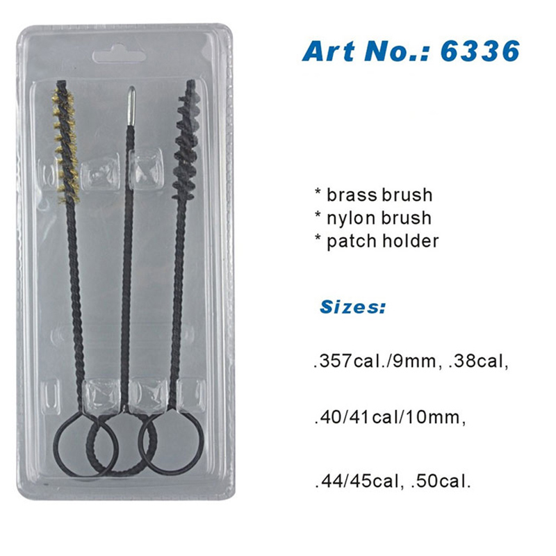 3 pcs set alat pembersih pistol, dikemas dalam lepuh ganda. Satu sikat pembersih lubang kuningan, satu sikat pembersih lubang nilon, dan satu tempat tambalan berlubang. Berguna dan efektif.