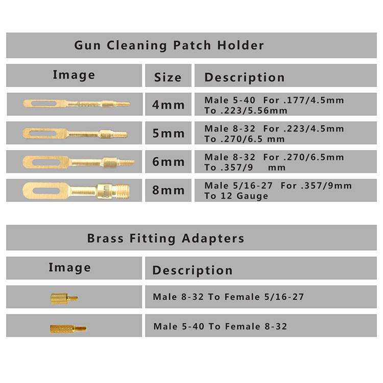 â—4 pemegang patch: 4mm pada pria 5-40, cocok untuk senapan .177-.223; 5mm pada pria 8-32, cocok untuk .223-.270cal. pasukan penembak; 6mm pada pria 5-40, cocok untuk senapan .270-.357cal, pistol .357-.45cal.; 8mm adalah laki-laki 5/16-24, cocok untuk semua pengukur senapan dan pistol dari .357cal. dan naik.