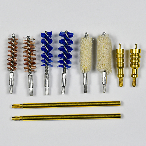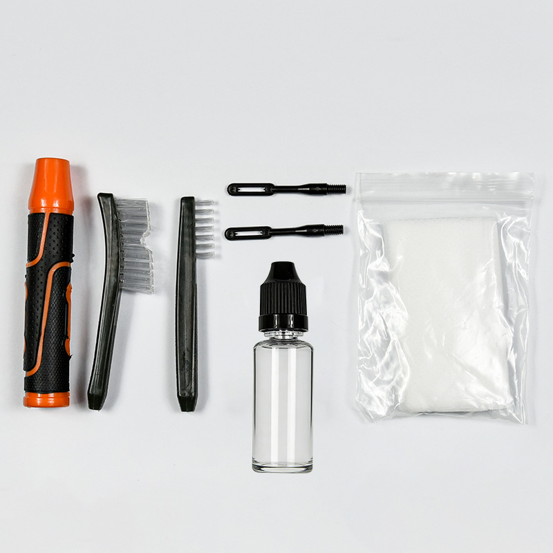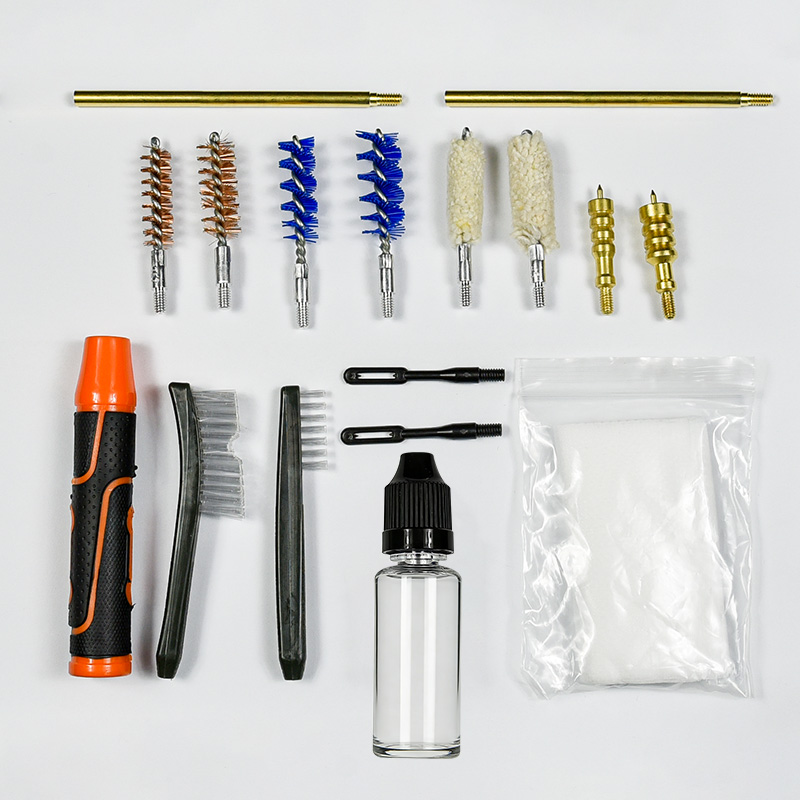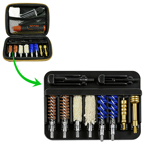 Kit pembersih pistol mencakup 2 ukuran (9mm & 0,45 kal.). Dilapisi kain OX Kotak PVC dengan ritsleting. Sikat kuningan, kain pel kapas, sikat nilon, jag kuningan, 2 batang. Pasir dan warna hitam untuk pilihan.