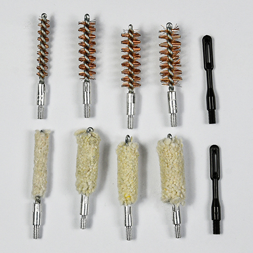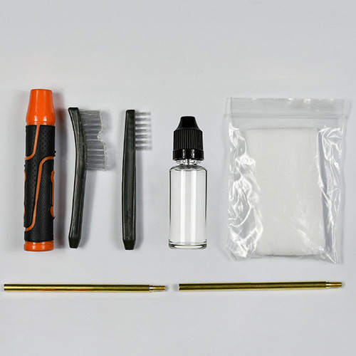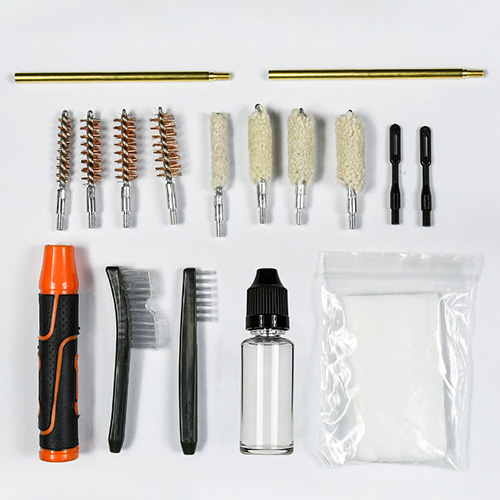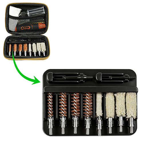 Kit pembersih pistol mencakup 4 ukuran (.22, 9mm, .40, .45cal.). Dilapisi kain OX Kotak PVC dengan ritsleting. Sikat kuningan dan kain pel kapas, 2 batang. Pasir dan hitam warna untuk pilihan.