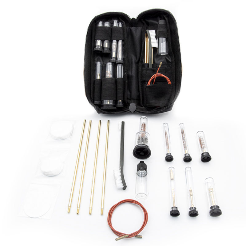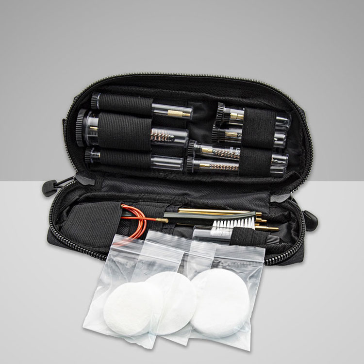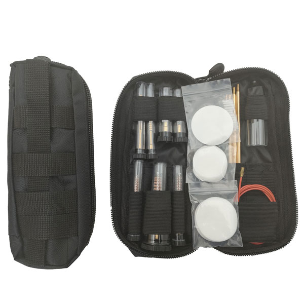 Tas taktis dengan jahitan luar biasa dari kain 600D yang dirancang untuk sistem molle, isinya sudah selesai kit pembersih senjata untuk senapan .177cal./4.5mm, .223cal./5.56mm. Sikat pembersih lubang tembaga, jag kuningan, sikat pembersih ruang (0,223) masing-masing dikemas dalam cangkang tabungnya, melindungi tangan dari rasa perih. Produk ini juga memiliki sikat serbaguna berujung ganda, tambalan pembersih, serta 5 batang pembersih kuningan (diameter 5 mm, panjang kerja penuh 32 inci/820 mm), kabel fleksibel berwarna merah 32 inci/ 820 mm untuk 0,177kal., pegangan penarik dan batang. Ukuran kecil mudah dibawa.